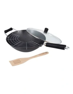 4 Piece Set which includes a) 31cm flat based non-stick wok, b) glass lid c) tempura rack and d) a wooden (slotted) wok turner