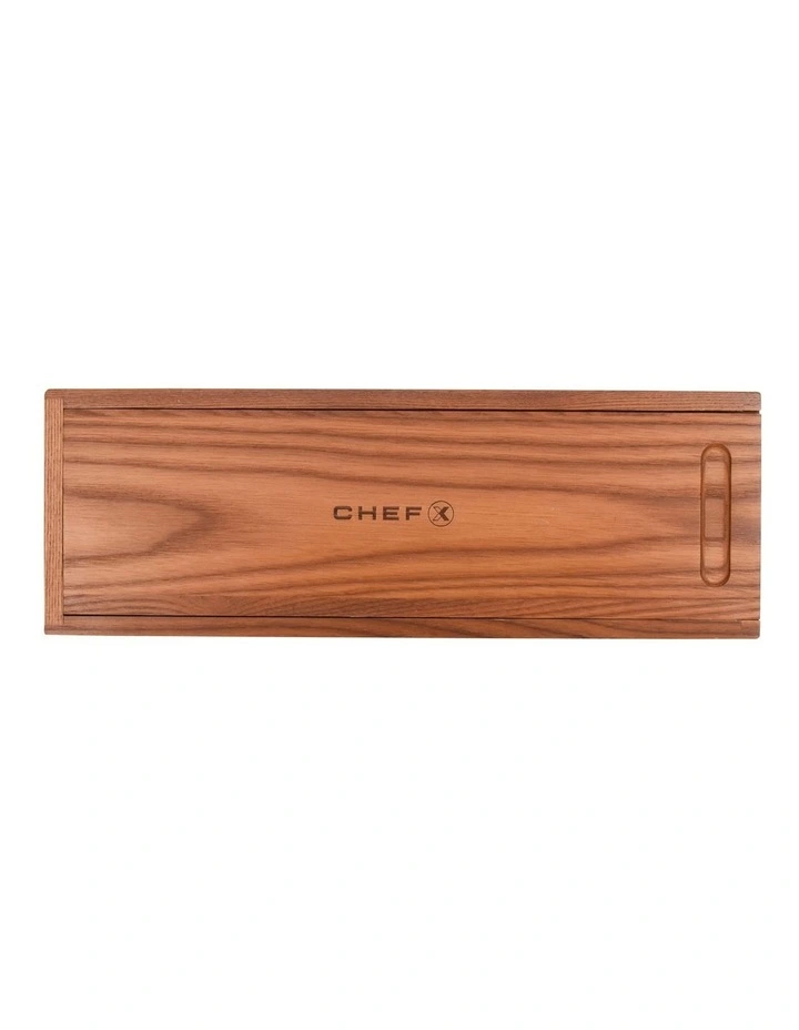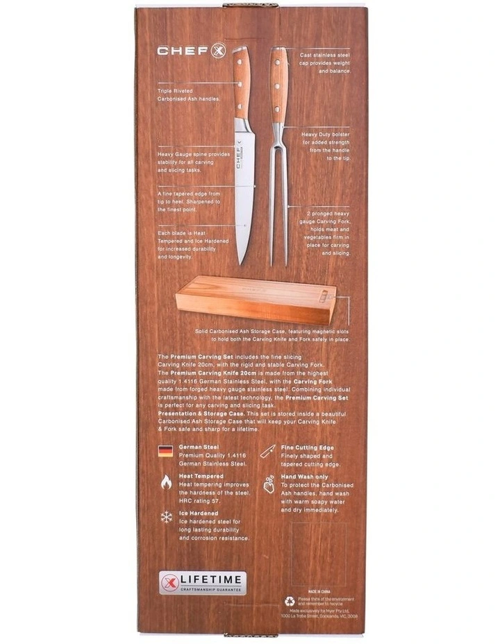 The ChefX Premium Carving Set includes the fine slicing Carving Knife 20cm, with the rigid and stable Carving Fork. The Premium Carving Knife 20cm is made from the highest quality 1.4116 German Stainless Steel with the Carving Fork made from forged heavy gauge stainless steel. Both handles are made using carbonised Ash wood and come complete with a Carbonised Ash storage case.